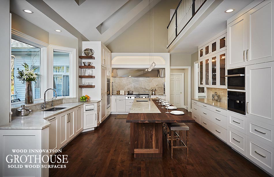 White kitchen islands with walnut top.